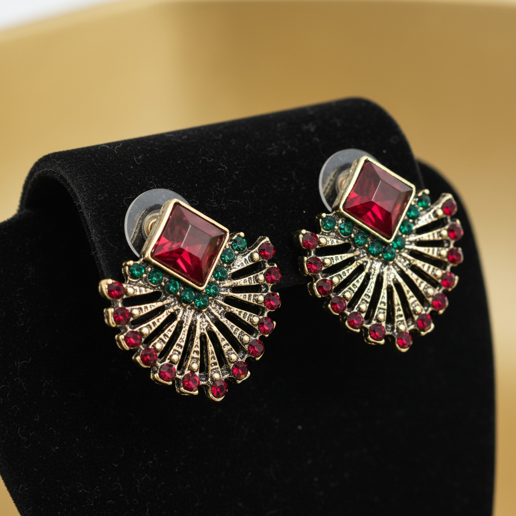 In Summary: They are dramatic, colorful, fan-shaped stud earrings with a vintage or holiday aesthetic, centered on a large red stone and highlighted by surrounding red and green accents.